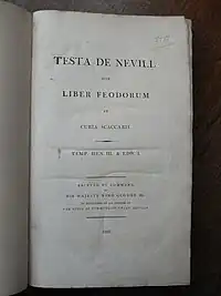 - Caley, John and William Illingworth (ed. and pref.). Testa de Nevill sive Liber feodorum in Curia Scaccarii. Temp. Hen. III & Edw. I. London, Exchequer / Record Commission, 1804.