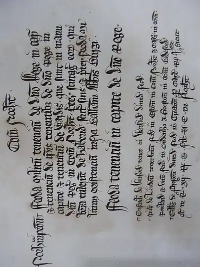 - The second collection consisted of two or more rolls of parchment, one of which is still extant, headed by the title Serjantie arentate per Robertum Passelewe tempore Regis H. filii Regis Johannis, meaning "Concerning the serjeanties let by Robert Passelewe in the time of King Henry III, son of King John".[5] It reports on the inquiries and their subsequent proceedings when Passelewe, a royal clerk and Bishop of Chichester, let (i.e. rented out, the technical term is "arrented") a number of lands held by the feudal land tenure of serjeanty. The text is accompanied by passages quoted from several documents which are also contained within the Testa de Nevill. Added to this are the returns for several counties in answer to an inquiry made in 1255.[5]