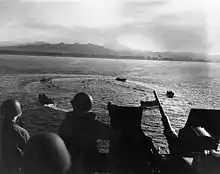 From the difficult landings at Guadalcanal and the New Georgias, Admiral Wilkinson had learned a significant lesson about the necessity of rapid unloading and getting his slow, vulnerable transports away from the landing area. To this end, he loaded his transports only half full and his cargo ships one-quarter full, and made sure that 30% of the troops on the beach assisted in unloading.[27] The Japanese, having been taken by surprise, were unable to mount an air assault on the invasion fleet. Wilkinson, grateful that his transports were able to land almost the entire troop contingent and a large amount of materiel unmolested by air attack, ordered them out of the area around sundown.[28]