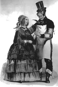 His girlfriend Lize was the prototypical g'hal, dressed in cheap finery and singing songs from her favorite minstrel shows.[6] Mose plays became an enormous hit in New York and other large cities, and theaters were filled with b'hoys and g'hals clamoring to see Chanfrau and other actors perform Bowery b'hoy characters. William Northall even complained that at the Olympic Theatre,