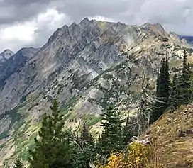 During the Pleistocene period dating back over two million years ago, glaciation advancing and retreating repeatedly scoured the landscape leaving deposits of rock debris.[5] The U-shaped cross section of the river valleys is a result of recent glaciation. Several glaciers lie on the slopes of Buck Mountain. Uplift and faulting in combination with glaciation have been the dominant processes which have created the tall peaks and deep valleys of the North Cascades area.