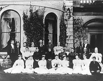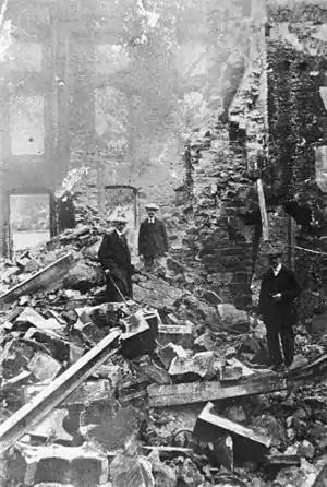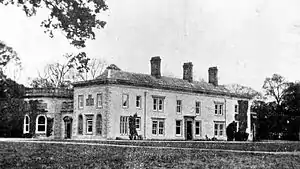 After the disastrous fire of 1918, which destroyed the entire front and south wing the third baronet demolished the ruins and reconstructed a smaller mansion around the remnants of the north wing. The tilled entrance to the smaller residence opened out on the left to a Dining Room in the shape of a clover leaf, with Oak panelled Dado (11metres x 9metres by 4.5metres high) lighted by three windows, with a service door to the kitchen quarters. On the right of the entrance was an Inner Hall (6.5m x 4m) lighted by two large windows, off which was the Drawing room (6.5m x 5.5m) lighted by one large double window facing south. The other rooms on the ground floor comprised a Smoking Room, Kitchen with two pantries off it, Scullery, Knife and Boot Cleaning room, Servants' hall, Gunroom, Lavatory; and two rooms, which were used as Estate offices. There was also a large cellar. The first floor comprised 6 bedrooms, bathroom and lavatory. The second floor was a repeat of the first.[20]