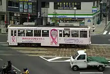 This trolley advertisement promotes cosmetics company Avon Products, Inc. and breast cancer awareness. Because of the pink ribbon brand's strength, the advertisement is easily recognized as a promotion for breast cancer awareness, even among people who cannot read the Japanese text.