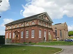 By 1928, navigation on the Brede was difficult, and could only be attempted on 2 days per fortnight. Use of barges ceased, and coal for the pumping engines was delivered by road to the tramway near Brede Bridge.[16] By 1935, the locomotive was worn out, and was scrapped. A road was built so that coal lorries could deliver coal to the works.[17] With demand for water still rising, work on the construction of Darwell Reservoir began in 1938, although it was not finished until 1951, due to delays caused by the Second World War. This supplied water to Brede pumps through a 6.5-mile (10.5 km) gravity aqueduct. Worthington-Simpson supplied a third triple-expansion pump in 1939–40, and the boilers for the engines were upgraded.[18] The engines were used until 1964, when electric pumps replaced them. They were held in reserve, but one of the Tangye engines was scrapped in 1969, as its steam receiver had cracked.[19] The boilerhouse chimney, which was 99 feet (30 m) tall, was demolished in the early 1980s, the buildings were given a Grade II listing in 1987, as they were of Special Architectural Interest, and in 1994 the Brede Steam Engine Society was formed, to conserve and maintain the engines.[20] The engines can be viewed by the public at regular open days, and a number of smaller engines and artefacts from the water industry have been assembled at the site.[21]