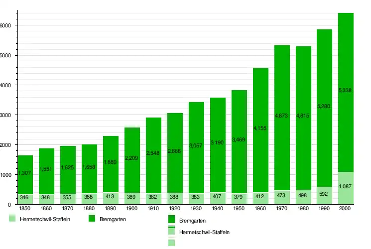 Bremgarten has a population (as of 31 December 2020) of 8,415.[9] As of 2008, 21.9% of the population was made up of foreign nationals.[10] Over the last 10 years the population has grown at a rate of 17%. Most of the population (as of 2000) speaks German (86.2%), with Albanian being second most common (3.0%) and Italian being third (1.9%).[7]