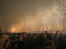 In addition to the carnival procession, the tradition of "squibbing" still occurs after the procession ends. A squib locally is a firework which is held aloft by a person known as a "squibber" on the end of a long wooden handle called a "cosh". One hundred squibbers stand in line in Bridgwater town centre making an unusual but impressive sight for visitors who crowd the High Street.[8]