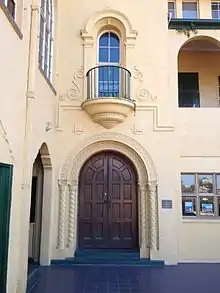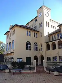 The main building dates from the early 1930s, when the school moved to the site, and is characterised by its arches and clock tower in the Mission Revival architecture style.[9] The Rudd and Hamilton wings, built in 1963, form a T-shape extending away from the main building, and the modern glass fronted Resource Centre, built in 1996, fills the quadrant. Other buildings on the site include McKenzie wing (built in 1983), Barbara Helen Thomson Sports Complex (opened in 1987), and the Birtles wing (built in 1973). The main Junior School precinct was completed in early 2008, and a separate building catering exclusively to Prep students was completed in mid 2007. The Junior School precinct was designed in light of the introduction of Years Prep to Grade 3 in 2007.[18] The old college hall (built in 1979) was demolished in late September 2009 and a new college hall was constructed and opened in early June 2011. The present college hall includes an air conditioned auditorium capable of seating 695 people, the Phil Bisset Gallery, and facilities for the music department.[19] In 2014, a new state of the art Middle School precinct was completed, which is situated next to the Junior School buildings.[20]