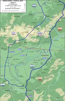 Over the next few days further orders to withdraw were received, with the Germans always in close pursuit, first to a line between Caix and Ceyaux and then between Mézières and Demuin. The increasingly tired troops managed a counterattack on 30 March with the 150th Brigade composite battalion driving the Germans (by this time equally tired) from Moreuil Wood.[110] The last gasp of the German offensive pushed the troops of 50th Division over the river Luce on 31 March, and on 1 April the division began to be relieved.[111]