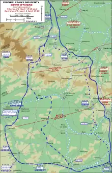 The division arrived in the area of Harbonnières on 9 March, on 12 hours notice to move while it conducted training.[103] The division's engineers and pioneers had been sent forward on 15 March to assist with XIX Corps defence works. The assault, aided by thick fog, began on the morning of 21 March, and the division was ordered into the rear "Green" line of defences between Péronne and St Quentin, North of and straddling the Roman road around Poeuilly, arriving exhausted after a long march early on 22 March and deploying all three brigades in the line. During the morning and early afternoon the 24th and 66th Divisions retired through their line, and at 4 p.m. the first German assaults began. The attack fell on all brigade fronts with some battalions being forced back, with the reserve battalions used to maintain a continuous front. The order to retire from the Green line was given in the evening, and next morning more orders to retire even further were received. But before the new line could be established, and while rear guards fought with the advancing Germans, more orders were received to withdraw to the Somme river.[104] After at times heavy fighting the increasingly tired men of the division crossed the Somme at Éterpigny, Brie and St. Christ-Briost through the 8th Division.[105]