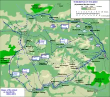 After a month the division was sent to the Armentieres sector, another relatively "quiet" sector,[lower-alpha 5] arriving between 17—18 July.[39] On 7 August the 6th/8th Battalion Durham Light Infantry was separated back into two battalions, coming under separate command on 11 August.[40] In September the division's artillery supported the opening of the Battle of Loos, the infantry also demonstrated on the front line to (unsuccessfully) deceive the Germans.[41] In early November the old 15-pounders of the artillery were replaced with new 18-pounders, and the worn out 4.7-inch guns replaced with new 4.5-inch howitzers.[42]