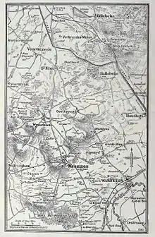 Between 21 and 24 June the division transferred to the line around Messines and Wytschaete, all three brigades would be in the line, in order from South to North, with two battalions in the front line.[37] Part of the 149 and 150th Brigades' lines near the River Douve were breastworks. This part of the line was considered to be quiet compared with the Ypres salient, but still included artillery duels, trench mortaring, grenades, sniping, mining and patrolling no-mans-land. The division still considered it a rest.[38]