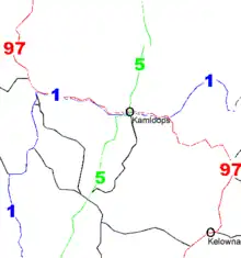 This diagram illustrates the wrong-way concurrency between Highways 5 and 97 through Kamloops. [4]