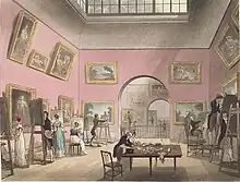 Other founding Governors included George Legge, 3rd Earl of Dartmouth as President, the Marquess of Stafford, Sir Francis Baring, 1st Baronet, William Holwell Carr, John Julius Angerstein, Sir Abraham Hume, 2nd Baronet, Sir Thomas Bernard, 3rd Baronet, and others. They were essentially the same group who were to succeed in persuading the government to found the National Gallery in 1824, and whose gifts to it provided most of the early collection. There was a total group of 125 Governors, Directors and Subscribers, paying sums between 100 guineas (56 of them, 35 at 50g., 11 at 10g.) down to one guinea annually. In 1805 the initial subscribers consisted of "One duke, five marquesses, fourteen earls, two viscounts, nine lords, two bishops, four ladies, seven baronets, twenty-two members of parliament, five clergymen and above fifty private gentlemen, bankers and merchants".[5] The Institution had been discussed with the Royal Academy before it was established, and relations were friendly, at least initially, though later there were to be tensions. The Prince Regent was Patron from the foundation, and loans from the Royal Collection continued throughout the life of the Institution. In 1822 the hereditary nature of the Governors was eased out, as they were becoming far too numerous, and the bottom end of the Subscribership tightened up.[6][7]