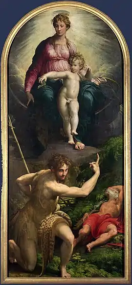 The Institution commissioned or bought a number of paintings which were presented to the National Gallery, and some other institutions. In 1826 they presented the Vision of Saint Jerome or Madonna and Child with Saints by Parmigianino (bought in 1823 for £3,302), the Consecration of Saint Nicholas by Paolo Veronese (bought in 1811 for £1,575),[12] and in 1830 the Market Cart by Thomas Gainsborough (bt 1829, Lord Gwydir's Sale, 1050 gn) and a Holy Family by Reynolds (same, 1950 gn.).[13] Modern works included Benjamin West's Christ Healing the Sick in the Temple, for which the very high price of 3,000 guineas was paid, though this was more than recouped by sales of an engraving commissioned by the Institution.[14] It was given to the National Gallery, but later transferred along with their British collection to what is now Tate Britain.