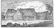 Tithe barn of St Johns, Bromsgrove, shortly before it was sold and demolished in 1844. It was used as a theatre in the 1700s.[43][lower-alpha 9]