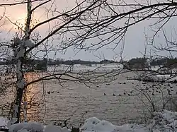 Reddy Branch flows along the northern and eastern edges of the town. It is a tributary of the Hawlings River, which flows east to the Patuxent River downstream from the Triadelphia Reservoir. Reddy Branch Stream Valley Park is located along Brookeville Road, to the west of the town, and to the east along Brighton Dam Road. Hawling Hills Park and Patuxent River State Park are located along New Hampshire Avenue, north of Ashton and to the east of Brookeville. Patuxent River State Park is used for hunting, fishing, hiking and horseback riding.[28] Rachel Carson Conservation Park, located to the north, is undeveloped and has a number of hiking trails.[29] The Triadelphia Reservoir, created by the Brighton Dam, is located on the Patuxent River. The Washington Suburban Sanitary Commission maintains 6,000 acres (24 km2), in and around the reservoir, which are open to the public for recreational purposes.[30] The reservoir is a popular recreation spot that is suitable for fishing, kayaking, and other activities.[31] Mount Zion Park is a small park with playgrounds, ball fields, tennis courts, and picnic facilities.[32] Within the town limits, Powers' Woods Park is a new 2-acre (8,100 m2) park that is slated to be located near a recently restored one-room schoolhouse.[33]