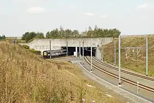 With the Schuman-Josaphat tunnel entering into service on 4 April 2016, a new connection was established to connect Brussels Airport directly to the stations of the EU quarter—Brussels-Schuman and Brussels-Luxembourg.[3] This brought the travel time between the Airport and the EU quarter to about 15 minutes.[4][5][6] The tunnel was originally scheduled to open on 12 December 2015, but it was delayed due to the Brussels lockdown. When it eventually opened in April 2016, it could not yet be used to its full potential as the airport station remained closed following the Brussels bombings.