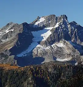 Buck Mountain is an 8,528-foot (2,599-metre) mountain summit located in the Glacier Peak Wilderness of the North Cascades in Washington state.[4] The mountain is situated in Chelan County, in the Wenatchee National Forest. Its nearest higher peak is Clark Mountain, 3.98 mi (6.41 km) to the southwest, and Brahma Peak is set 1.8 mi (2.9 km) to the south. Precipitation runoff from it drains into Buck Creek, Chiwawa River, and Napeequa River, each a tributary of the Wenatchee River. The mountain's name was applied by Albert Hale Sylvester (1871-1944), a pioneer surveyor, explorer, topographer, and forest supervisor in the Cascades.