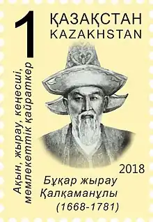 Bukhar-zhirau Kalkaman Uli (also: Bukhar-zhyrau Kalkamanuly, Kazakh: Бұқар жырау Қалқаманұлы; Russian: Буха́р жыра́у Калкама́нулы; 1668–1771) was a Kazakh poet at the court of the Middle Horde. His was active at the court during the reign of the Ablai Khan. Although his primary activity was law-making, poetry and singing, Kalkaman Uli also acted as an advisor to the Khan. Because of this, his poetry dealt with broader themes which included politics, the foreign policy of the horde, and the life of the Khan. Bukhar-jirau is not known to have written any epics.