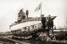 Upon acceptance of UB-8 by the Bulgarian Navy, she was renamed Podvodnik No. 18 (in Cyrillic: Подводник №18).[4][26] Although the commissioning ceremony for Podvodnik No. 18 was kept out of newspapers, it was attended by Crown Prince Boris and his brother Prince Kiril, who both boarded the submarine for a ceremonial first voyage to Euxinograd, the Bulgarian summer palace located just north of Varna.[25] In Bulgarian service, the submarine was armed with a 47-millimeter (1.9 in) deck gun that supplemented its machine gun.[25]