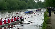 The first attested bumps race, and the first attested race between two clubs anywhere in the world, took place in Oxford in 1815. This was between two eights from Brasenose College and Jesus College.[2] The fact the racing was conducted in eight-oared boats gave rise to the event being known as Eights.[3] The practice began with the two colleges racing upstream from Iffley Lock to a finishing line just short of Folly Bridge. The crews began one behind the other in the lock, with each having to push their way out of the lock before being able to commence racing. This created an inevitable gap between boats, with the one behind trying to bump the one in front to claim victory. The boat in front could claim to be "Head of the River" if they avoided being bumped. As the number of crews contesting races increased, races ceased to start in the lock, and instead were started from the bank upstream of the lock. This first occurred in 1825 or 1826.[4]