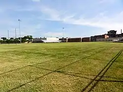 The park's site is now occupied by a Boys and Girls Club, including an athletic field at the same location of the original playing field (top). A sign at Grand & Dodier marks the stadium's site (bottom).
