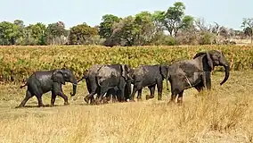 Several rare large mammal and bird species are found in Bwabwata. Elephants regularly move between Namibia, Angola, Botswana and Zambia. Other species found are Cape buffalo, hippopotamus, roan antelope, sable antelope, tsessebe, zebra, wildebeest, common reedbuck, red lechwe, sitatunga and crocodile. Main predators are lion, leopard, cheetah and spotted hyena.[6]