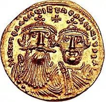 In 608, general Heraclius the Elder, Exarch of Africa, revolted, urged on by Priscus, the Count of the Excubitors and son-in-law of Phocas.[29][30] Heraclius proclaimed himself and his namesake son as consuls—thereby implicitly claiming the imperial title—and minted coins with the two wearing the consular robes.[31]