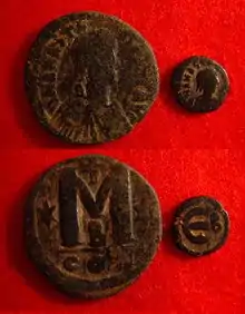 The start of what is viewed as Byzantine currency by numismatics began with the monetary reform of Anastasius in 498, who reformed the late Roman Empire coinage system which consisted of the gold solidus and the bronze nummi. The nummus was an extremely small bronze coin, at about 8–10 mm, weight of 0.56 g making it at 576 to the Roman pound[3] which was inconvenient because a large number of them were required even for small transactions.