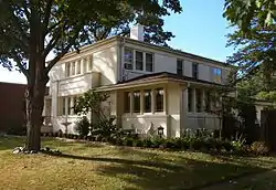 The C.F. Franke House is a historic building located in Mason City, Iowa, United States. Built in 1916, the exterior of the two-story structure is covered with stucco. It utilizes the Mason City variant of the Prairie School style to stucco over corbelled masonry to form the wall panels for visual effect.[2] Although the eaves on the second story were cut back almost flush with the walls, the house maintains its horizontal emphasis, including the grouping of the casement windows. It was listed on the National Register of Historic Places in 1980.[1]