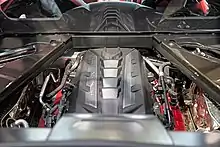 The Stingray uses a new version of the LS-based GM small-block engine derived from the C7 Stingray's LT1, now called the LT2.[14] The new naturally aspirated 6.2 L V8 is rated at 490 hp (365 kW; 497 PS) at 6,450 rpm and 465 lb⋅ft (630 N⋅m) of torque at 5,150 rpm, an improvement of 40 hp (30 kW; 41 PS) and 10 lb⋅ft (14 N⋅m) over the outgoing C7 Corvette Stingray.[15] The engine uses dry sump lubrication system.[16] Like the C7, the C8 features Active Fuel Management, or cylinder deactivation, which is used when the car is subjected to low load scenarios such as highway cruising.[17][18]