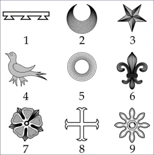 - ↑ Brooke-Little, J. P. (1996). An heraldic alphabet (New and rev. ed.). London: Robson Books. p. 31. ISBN 1-86105-077-1. OCLC 41294384.