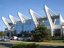 In the late 1990s and throughout the 2000s several modern buildings were built and opened to the public. In 1999 a brand new fitness complex including four indoor swimming pools and a jacuzzi was opened as part of the city's center for sports and recreation. In 2003 a renovated sports hall, originally built in the 1970s and belonging to the construction industry high school, was also opened as a part of the center for sports and recreation and hosted several group matches of the 2003 World Women's Handball Championship. Beginning in the late 1990s and early 2000s several large shopping centers and car showrooms emerged in the city, mostly in its northwestern part. Čakovec was twice rewarded The Green Flower award for the tidiest continental city in Croatia, in 2008 and 2009. Čakovec is the first city of the former Yugoslavia to have installed completely electronic information spots, located at the Republic Square and the Franciscan Square in the Center and at the Square of Saint Anthony of Padua in the Jug district. Čakovec is known as the city of traffic circles, because, during the late 1990s and early 2000s, all of its traffic lights in the inner part of the city were removed and replaced with traffic circles or rotaries, virtually eliminating traffic jams. The only remaining traffic lights in the city are located on the southern bypass. Although Čakovec is a small city by global parameters, its large working force which comes from all over the county, its location and importance in the region caused many traffic jams on the crossroads. Čakovec is home of many famous Croatian punk bands, including Bakterije and Motorno Ulje.