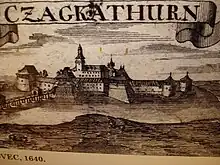 The name Čakovec (Hungarian: Csáktornya, German: Csakathurn or Tschakathurn) comes from the first name of the ispán Csák Hahót. With the beginning of the 13th century he erected the timber fortification which was later named Csák's tower (Croatian: Čakov toranj). It was mentioned for the first time in 1328 and the place appeared in the official books in 1333. From 1350 to 1397, it was in the possession of the House of Laczkfy, from 1405 to 1461 of the Counts of Celje and from 1473 to 1540 of the House of Ernušt. The town as well as Međimurje region was part of Varaždin county[5] until 1720.[6][7] When count Johann Michael von Althan became the owner of Međimurje in 1719, the very next year Čakovec and the whole region was detached from Croatia and included into Zala county,[8] i. e. into the main part of the Habsburg Kingdom of Hungary. The town was part of Hungary until 1918 when it was added to the Kingdom of Serbs, Croats and Slovenes.