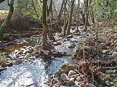 Calabazas Creek originates about 4 mi (6 km) northeast of the town of Glen Ellen, California, just north of Trinity Road, at the top of Nunns Canyon.[1] Its headwaters form from the convergence of several unnamed perennial streams.[2] It descends in a westward direction through the canyon, augmented by the waters of Nunns Iron Spring and other tributaries, and parallels Nunns Canyon Road. It emerges into the Valley of the Moon and turns southward, passing under State Route 12 at milepost 29.41.[12] It flows west of the town of Agua Caliente. As it parallels Henno Road southward into Glen Ellen, it is fed by Stuart Creek. Just after it crosses Arnold Drive, it empties into Sonoma Creek.