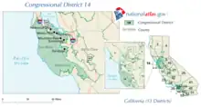 As of the 2022 United States House of Representatives elections, the 14th district is in Alameda County and includes the cities of Hayward, Pleasanton, Livermore, Union City, Castro Valley, and parts of Dublin and Fremont.[3] Immediately prior to that, the district included most of San Mateo County and the southwest side of San Francisco.