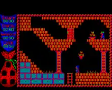 The player has four-way directional controls, left, right, up and down (for climbing ladders) and there are also separate keys for jump, firing a fireball, picking up objects and using a spell book. Energy can be replenished by finding hearts hidden in caskets, although some caskets contain daemons instead, which drain the player's energy. The game does have a time limit, but extra time is gained by opening doors and solving puzzles, so the player must work out a logical sequence of puzzle-solving such that the clock does not run down to zero.[1][3]