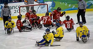 The Canada national ice sledge hockey team is the men's team representing Canada at international competition. The team has been overseen since 2003 by Hockey Canada, a member of the International Ice Hockey Federation. From 1993 until 2003, the team was an associate member of Hockey Canada.[1] Since 2010 international para ice hockey has been a mixed, However there has only been one woman to ever play on the Canadian team.[2] The national team created exclusively for Canadian women is the Canada women's national ice sledge hockey team. This article deals chiefly with the national men's team.