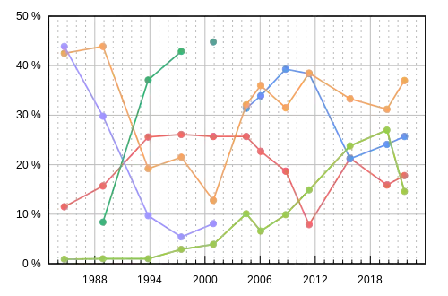 Election | Liberal | Conservative | New Democratic | Green | PC | Reform / Alliance |