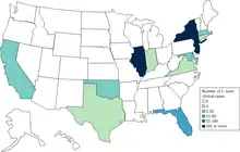 As of 31 August 2019 the number of cases of people having contracted C. auris in the United States had risen to 806, with 388 reported in New York, 137 in New Jersey and 227 in Illinois, according to the CDC.[4][30]