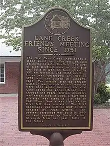 The Cane Creek Friends Meeting, founded in 1751,[2] is considered the first established Quaker community in the Piedmont region of North Carolina. The site was occupied by British troops during the American Revolutionary War.