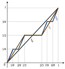 It is also called the Cantor ternary function, the Lebesgue function,[1] Lebesgue's singular function, the Cantor–Vitali function, the Devil's staircase,[2] the Cantor staircase function,[3] and the Cantor–Lebesgue function.[4] Georg Cantor (1884) introduced the Cantor function and mentioned that Scheeffer pointed out that it was a counterexample to an extension of the fundamental theorem of calculus claimed by Harnack. The Cantor function was discussed and popularized by Scheeffer (1884), Lebesgue (1904) and Vitali (1905).