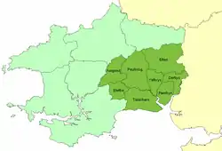 The name means "upper-most zone".[2] Its area was about 244 square miles (630 km2). Unlike the other Dyfed cantrefi which were divided into two (or fewer) commotes, Cantref Gwarthaf was divided into eight commotes: Amgoed, Derllys, Efelfre, Elfed, Penrhyn, Peuliniog, Talacharn, and Ystlwys. Its civil headquarters were at Carmarthen. Its ecclesiastical centre (and perhaps, in the Age of the Saints, the seat of a bishop[3]) was probably also Carmarthen, although the churches at Llanddowror and Meidrim were also important.