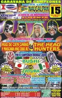 Zatura's reign as the IWRG Intercontinental Lightweight Championship only lasted one match as he lost the belt to Trauma II on June 18, 2009.[7] Los Terrible Cerebros would go on to defend the championship throughout 2009, but in 2010 the championship was declared vacant as the champions had not teamed together for a while.[9] Los Oficiales reign as IWRG Intercontinental Trios Champions until March 2011 when they were defeated by Los Maniacos ("The Maniacs"; Silver King, Joe Líder and Último Gladiador.[10] Hijo de Cien Caras and Máscara Año 2000 Jr. had no more successful title defenses after defeating the Headhunters, losing the tag team titles to Scorpio Jr. and Ricky Cruzz on August 9, 2009.[7]