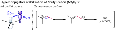 The stabilization by alkyl groups is explained by hyperconjugation.[30] The donation of electron density from a β C-H or C-C bond into the unoccupied p orbital of the carbocation (a σCH/CC → p interaction) allows the positive charge to be delocalized.