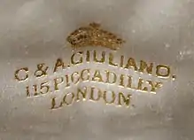 Carlo Giuliano (1831–1895) was a goldsmith and jeweller operating in London from 1860. He started work in Naples for Alessandro Castellani and was sent to London to establish a branch of the Casa Castellani. He left Castellani's employ in the early 1860s and in turn worked for Robert Phillips, Harry Emanuel, Hunt & Roskell, and Hancocks & Co - all leading London jewellers. In 1875, he set out on his own, starting a retail outlet at 115 Piccadilly, and specialising in Renaissance-style design.[1]