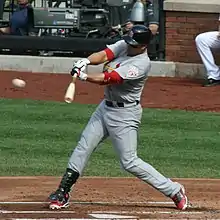 In 2008, Beltrán batted .284 with 27 home runs and 112 RBI.[11] In the final game before the All-Star game, Beltrán hit his 15th home run of the season.[51] On August 29, Beltrán collected all five RBIs for the Mets including a grand slam with two outs in the 9th to give the Mets a 5–2 lead.[52] The Mets won this game 5–4. Beltrán hit the last and only Mets home run in the final regular season game at Shea Stadium (the last home run was by Dan Uggla). The home run was a two-run shot that tied the game 2–2 against the Florida Marlins.[53] Beltrán won his third straight Gold Glove award in the outfield for the Mets.[11] He also won his second Fielding Bible Award as the top MLB center fielder in 2008.[54]