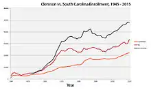 In the past ten years, Clemson has experienced a larger percentage of enrollment growth over its rival school. Since 2005, Clemson University has grown by 30.5 percent[61] compared to USC's 24.5 percent growth at its main Columbia campus and a 22.5 percent enrollment increase in the entire USC system.[62] Both schools currently enroll more students than any time in their entire history.