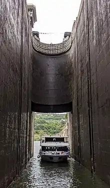 On the right side of the dam is a lock, which can handle ships with the following maximum properties: 83 m in length, 11.40 m on the beam, 3.8 m load-draught and a cargo capacity of 2500 tons.[6] The water level change through the lock is about 35 m.