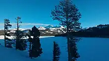 To scale the western slope of the Sierra Nevada, East of Pine Grove Highway 88 follows a ridge that separates the watershed of the North Fork Mokelumne River to the south of the highway, with a number of other watersheds to the north. At lower elevations the watershed to the north of this ridge is initially Sutter Creek, later the South Fork Cosumnes River, and later still that of the Middle Fork Cosmunes River. At the highest elevations the watershed to the north of the road and the ridge is the Silver Fork American River. Several overlooks are located at spots where SR 88 follows this ridge which provide views into the canyons of each of these rivers. For several miles this ridge, and by extension SR 88, form the boundary between Amador and El Dorado County.[5] In the lower parts of this ridge are the settlements of Pioneer and Buckhorn. Two small settlements are located in the higher elevations of this ridge, Cooks Station, and Ham's Station. Both of these are today known as locations where Caltrans implements traveling restrictions during winter storms, such as requiring tire chains, restricting certain vehicles or complete closures.[15] Where this ridge crosses the divide between the Cosumnes and American Rivers is where the road joins the Mormon Emigrant Trail, which follows a different ridge up the mountains from the modern U.S. Route 50 corridor near Sly Park.[5] This trail is so named for the Mormons in California during the gold rush, who created this path to rejoin the Mormon migration to Utah.[16] Just past Silver Lake, Route 88 reaches a geographic feature known as the Carson Spur. This is where this ridge effectively ends, and the road follows a dynamited path down to the Kirkwood Mountain Resort and the small town of Kirkwood, where the road crosses into Alpine County.[17] The Carson Spur section is prone to frequent avalanches in the winter and is periodically closed for avalanche control measures.[18][19] In the final push up to Carson Pass the road passes by Caples Lake.[5]